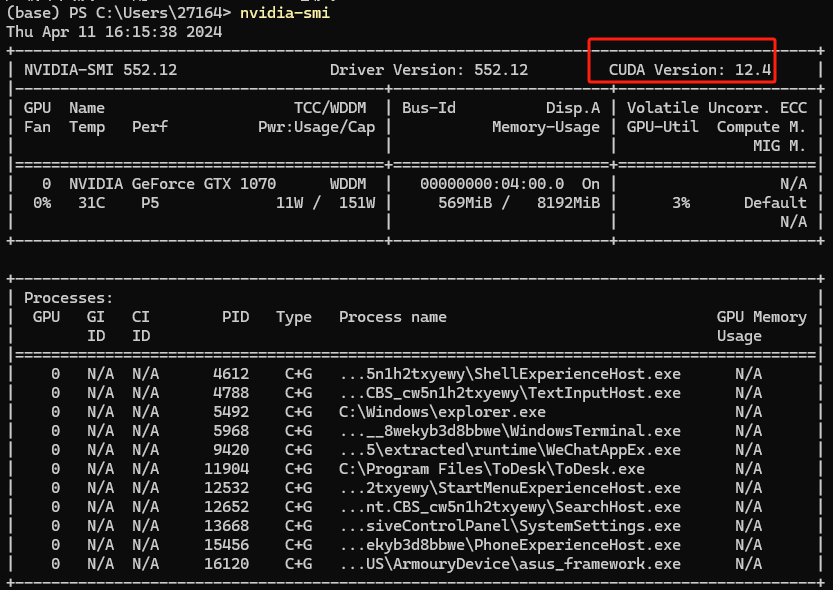 查看显卡驱动支持的CUDA的最高版本,小于等于此版本的CUDA均可以使用。CMD或powershell中执行如下命令: