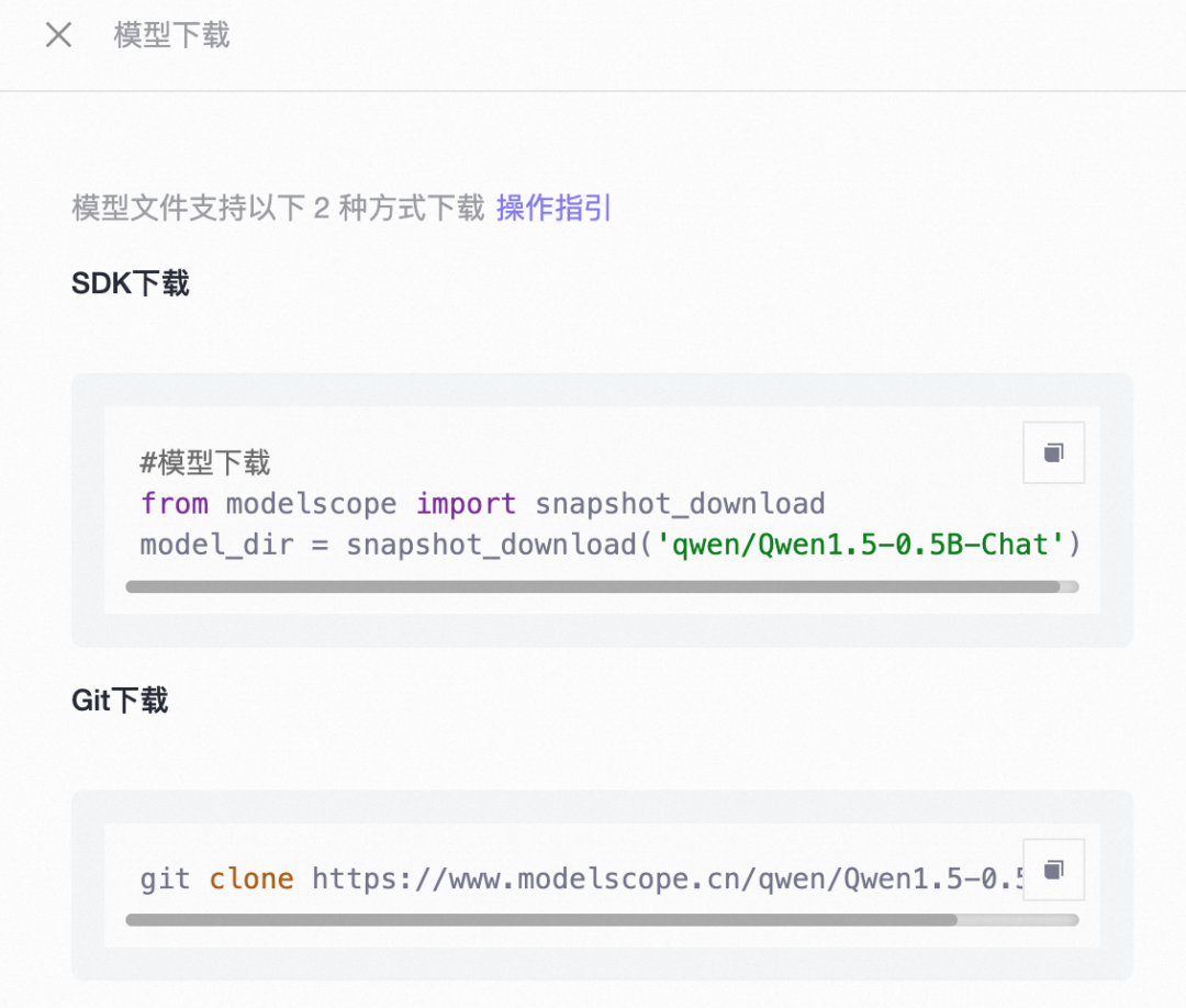 点击模型文件 -> 下载模型,可支持两种下载方式:Sdk和Git