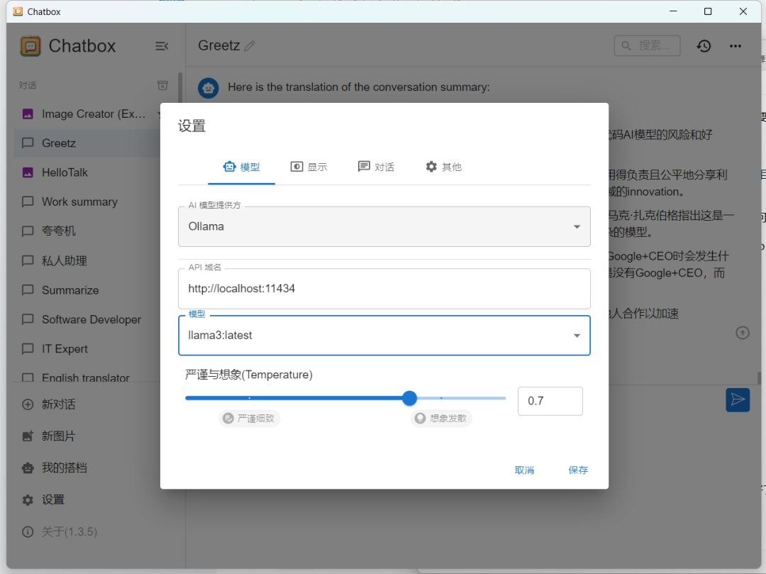 下载安装后,进入设置,配置使用本地ollama的llama3模型,之后就可以愉快的聊天了。