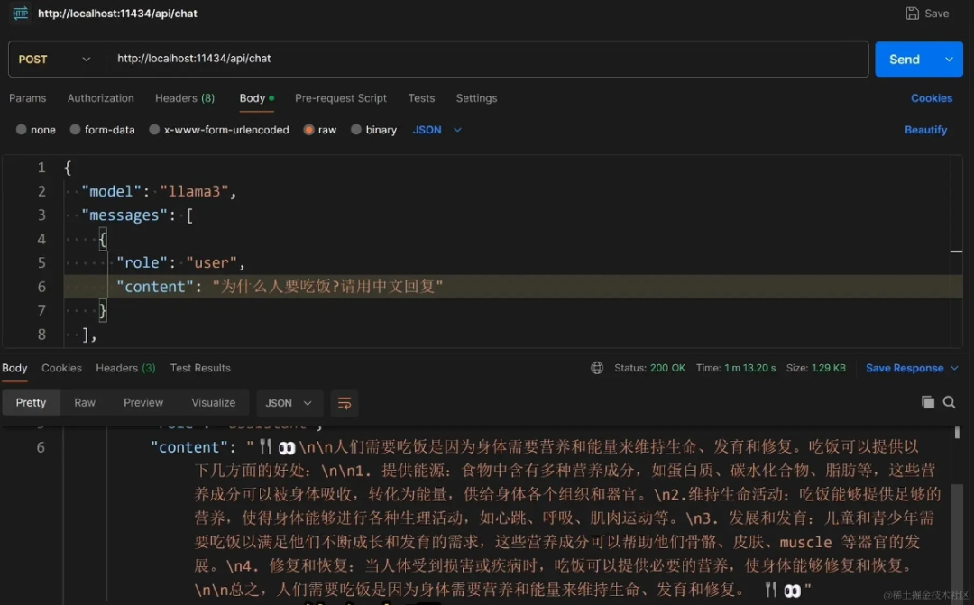 除了通过图形化界面和Llama3聊天外,还可以自己编程调用Llama3的rest api,自动化让AI完成很多本地工作。