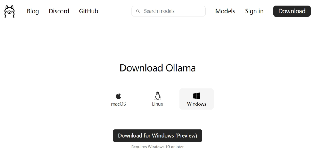step1:ollama官网(https://ollama.com/download)下载ollama,有mac,windows,linux三个版本,选择适合自己机器的版本下载并安装。
