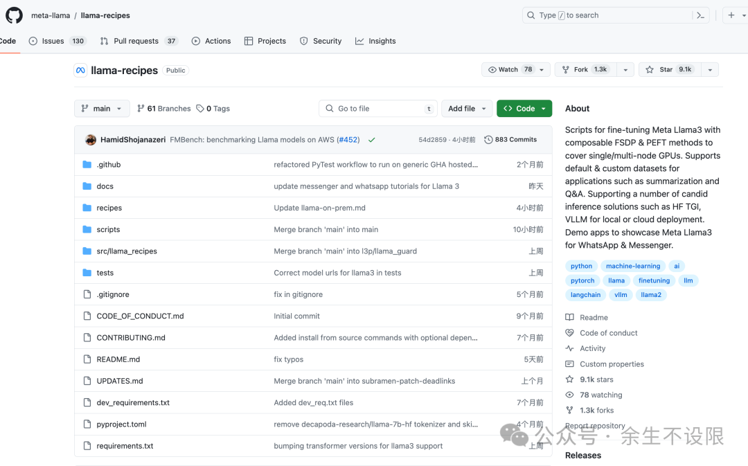 “llama-recipes”存储库是Meta Llama 3模型的配套产品。该存储库的目标是提供一个可扩展的库,用于微调 Meta Llama 模型,以及一些示例脚本和笔记本,以便快速开始在各种用例中使用模型,包括域适应的微调和使用 Meta Llama 和 LLM 生态系统中的其他工具构建基于 LLM 的应用程序。这里的示例展示了如何在本地、云端和本地运行 Meta Llama。此存储库还支持Meta Llama 2 。由于Meta Llama 3的增强功能,我们强烈建议大家使用它。