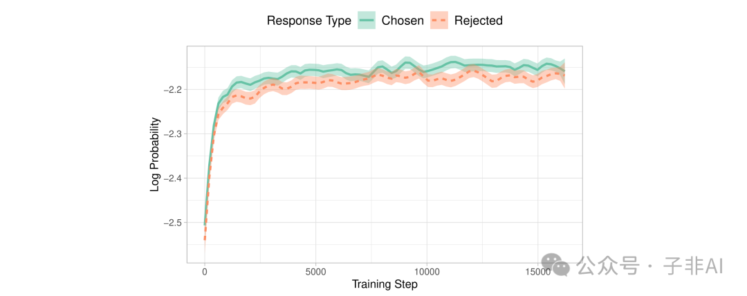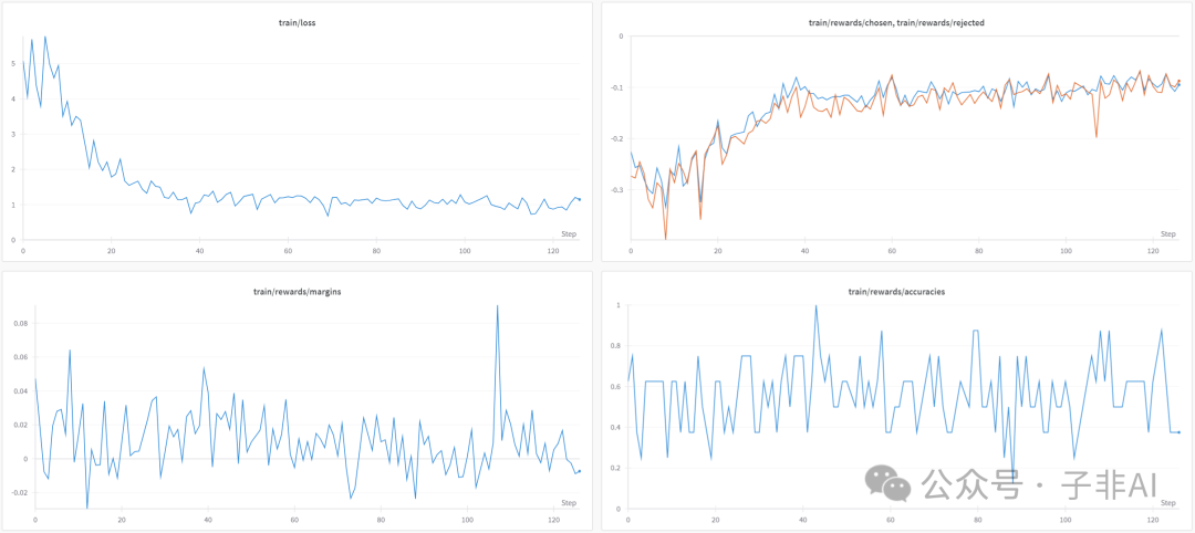 虽然损失下降了,但选择答案和拒绝答案之间的差异并不明显:平均边际和准确率分别略高于零和 0.5。