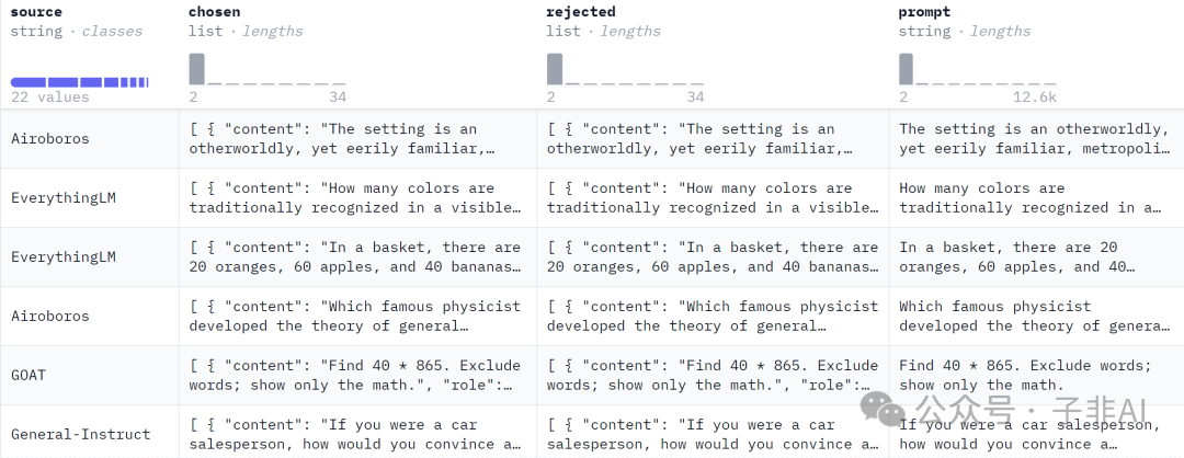 ORPO 需要一个偏好数据集,包括一个提示、一个选择的答案和一个拒绝的答案。在这个例子中,我们将使用 mlabonne/orpo-dpo-mix-40k,它是以下高质量 DPO 数据集的组合: