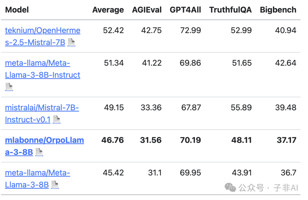 恭喜,我们完成了对 Llama 3 的快速微调:mlabonne/OrpoLlama-3-8B。你可以使用这个 Hugging Face Space 来玩它(这里有一个笔记本可以让你自己制作)。虽然模型训练不足,正如 W&B 曲线所强调的那样,但我使用 LLM AutoEval 在 Nous 的基准套件上进行了一些评估。