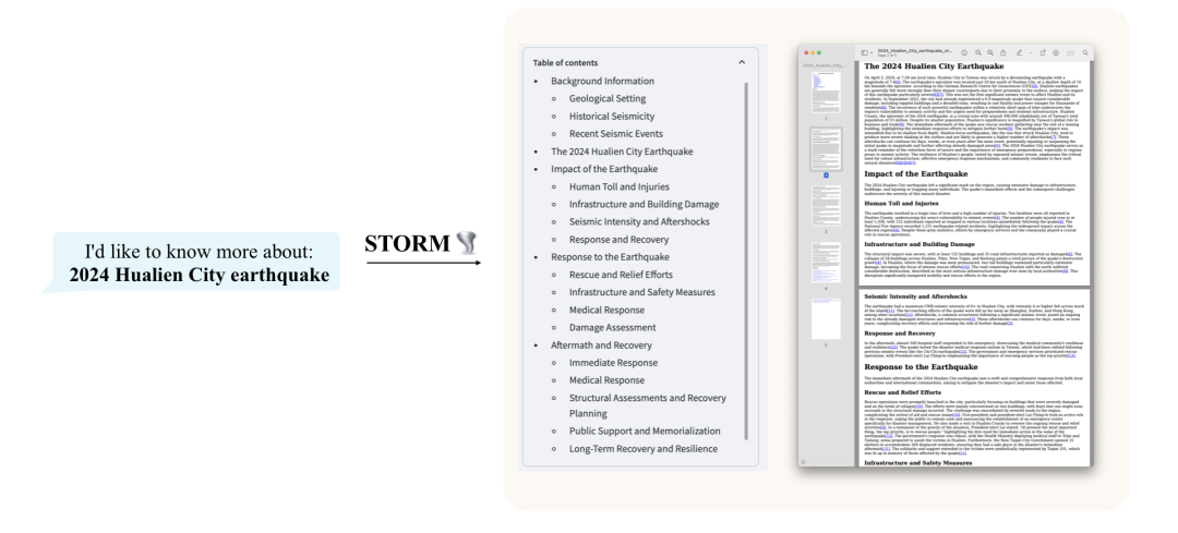 STORM 是一个由大型语言模型(LLM)驱动的知识整合系统,它能够从零开始研究一个主题,并生成带有引用的完整报告。