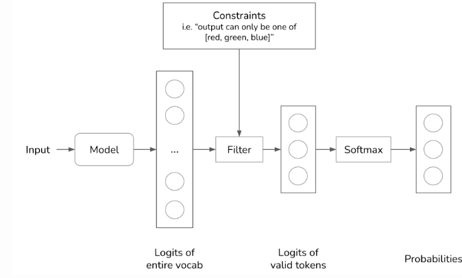 由于我们假设模型本身无法完成此任务,因此需要采用采样和微调技术。随着模型变得更加强大,我们可以期待它能够更好地遵循指令。在未来,使模型在最少的提示下输出我们所需的内容将变得更为容易,这些技术(提示、采样、微调)将不再那么重要。 约束采样 约束采样是一种用于引导文本生成朝向特定约束的技术。正如在“测试时采样”一节中所讨论的,持续生成输出直至找到符合约束条件的输出是最简单的方式,但成本高昂。 约束采样也可以在词元采样过程中进行。据我所知,目前介绍公司如何进行约束采样的文献并不多。以下内容是我的个人见解,可能存在错误,欢迎反馈和指正! 总的来说,为生成一个词元,模型会在满足约束条件的值中采样。回想一下,为了生成一个词元,你的模型首先会输出一个逻辑向量,其中每个逻辑对应一个可能的值。通过约束采样,我们会过滤这个逻辑向量,只保留符合约束条件的值。然后从这些有效值中采样。