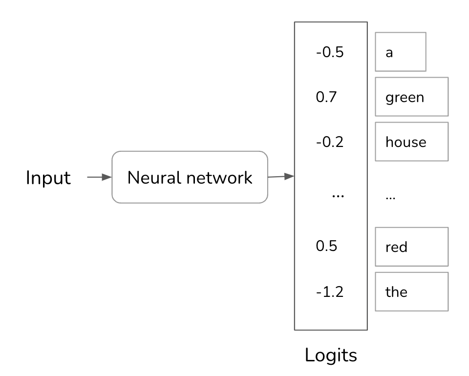 温度 根据概率分布采样生成下一个词元存在一个问题,即模型可能缺乏创造力。在之前的例子中,红、绿、紫等常见颜色词具有最高概率。语言模型的答案最后听起来就像是一个五岁孩子说的话:即我最喜欢的颜色是绿色。由于“the”等修饰限定词出现的概率较低,模型不太可能生成“我最喜欢春日清晨平静湖面的颜色”等富有创意的句子。 温度(temperature)是一种用于重新分配可能的值概率的技术。直观地说,它会降低常见词元的概率,从而增加罕见词元的概率,使模型能够生成更具创意的回应。 为理解温度的工作原理,我们需要先理解模型计算概率的方式。给定一个输入,神经网络处理这个输入并输出一个logit向量。每个logit对应一个可能性。对于语言模型而言,每个logit对应模型词汇表中的一个词元。logit向量的大小即为词汇表大小。