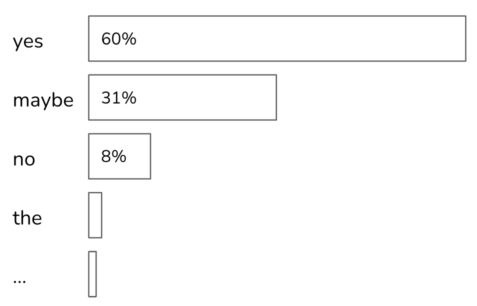 假设所有词元的概率如下图所示。如果top_p=90%,那么只有"yes"和"maybe"会被考虑,因为它们的累积概率大于90%。如果top_p=99%,那么将考虑"yes"、"maybe"和"no"。