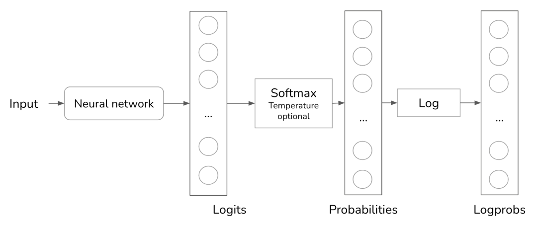 虽然更大的logit对应着更高的概率,但logit本身并不代表概率。logit的总和并不是1,它甚至可能是负数,但概率必须为非负数。为了将logit转换为概率,通常会使用一个softmax层。假设模型的词汇表大小为N,logit向量为,则词元的概率的计算公式为: