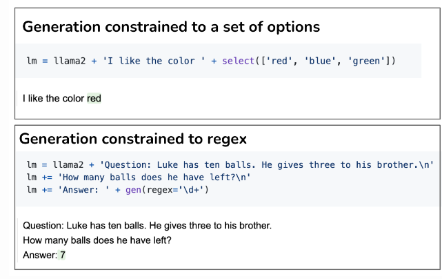 OpenAI是第一个在其文本生成API中引入JSON模式的模型供应商。需要注意的是,他们的JSON模式仅保证输出是有效的JSON格式,而不保证JSON的内容。截至目前,OpenAI的JSON模式尚不适用于视觉模型,但这只是时间问题。 因为模型的停止条件(例如达到最大输出词元长度),生成的JSON也可能被截断。如果最大词元长度设置得太短,输出的JSON可能会被截断,因此无法被解析。如果设置得太长,模型的响应会变得慢且昂贵。 guidance(github.com/guidance-ai/guidance)和outlines(github.com/outlines-dev/outlines)等独立工具可帮助结构化某些模型输出。以下是使用guidance生成受限于一组选项和正则表达式的输出的两个示例。