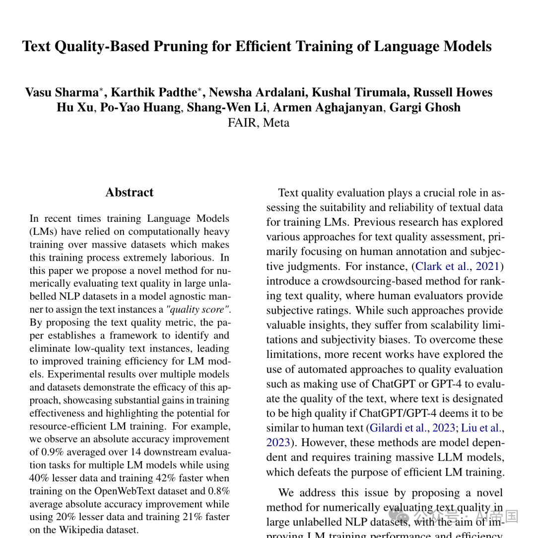 论文标题:Text Quality-Based Pruning for Efficient Training of Language Models
