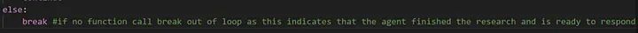 由于 LLM 无法自行重复此过程,我们需要使用应用程序逻辑来管理。我们可以通过将整个过程放入循环中来实现这一点。当模型准备好给出最终答案时,循环结束: