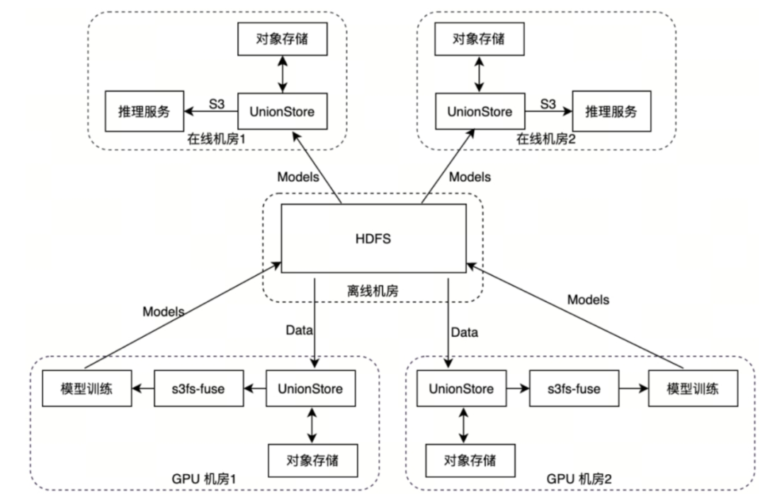 为了解决模型训练及模型分发场景跨云读取数据的痛点,知乎在早期自研了一个缓存系统 — UnionStore。顾名思义,UnionStore 是联合存储的意思,它联合了对象存储与 HDFS,利用对象存储来对外提供本机房缓存。它支持对象存储协议,这样用户可以使用 AWS S3 的 SDK 来访问数据。