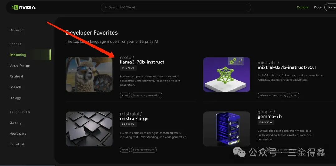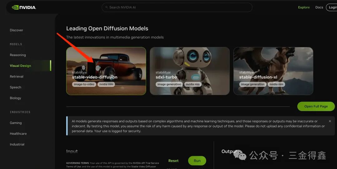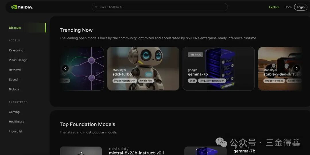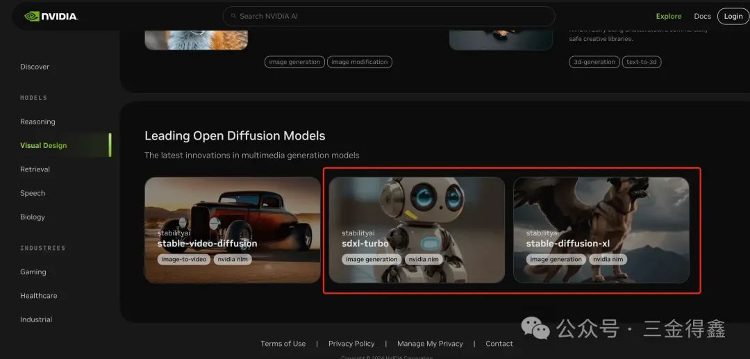 今天在逛英伟达官网的时候,发现在他们网站上可以免费使用各种比较火的开源大模型,包括: Chat 对话、推理:Llama-3、Phi-3 等; 文生图:sdxl-turbo、stable-diffusion-xl、edify-image、edify-3d-early-access(3D 的喔~); 文生视频:Stable-video-diffusion;