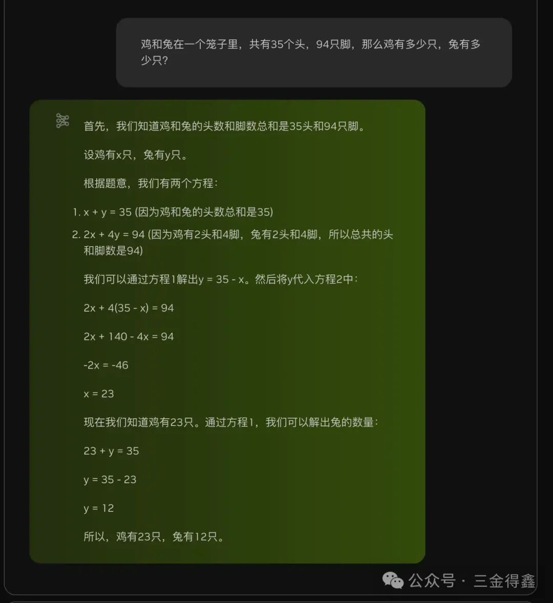 直接问一道经典鸡兔同笼问题: 鸡和兔在一个笼子里,共有35个头,94只脚,那么鸡有多少只,兔有多少只?