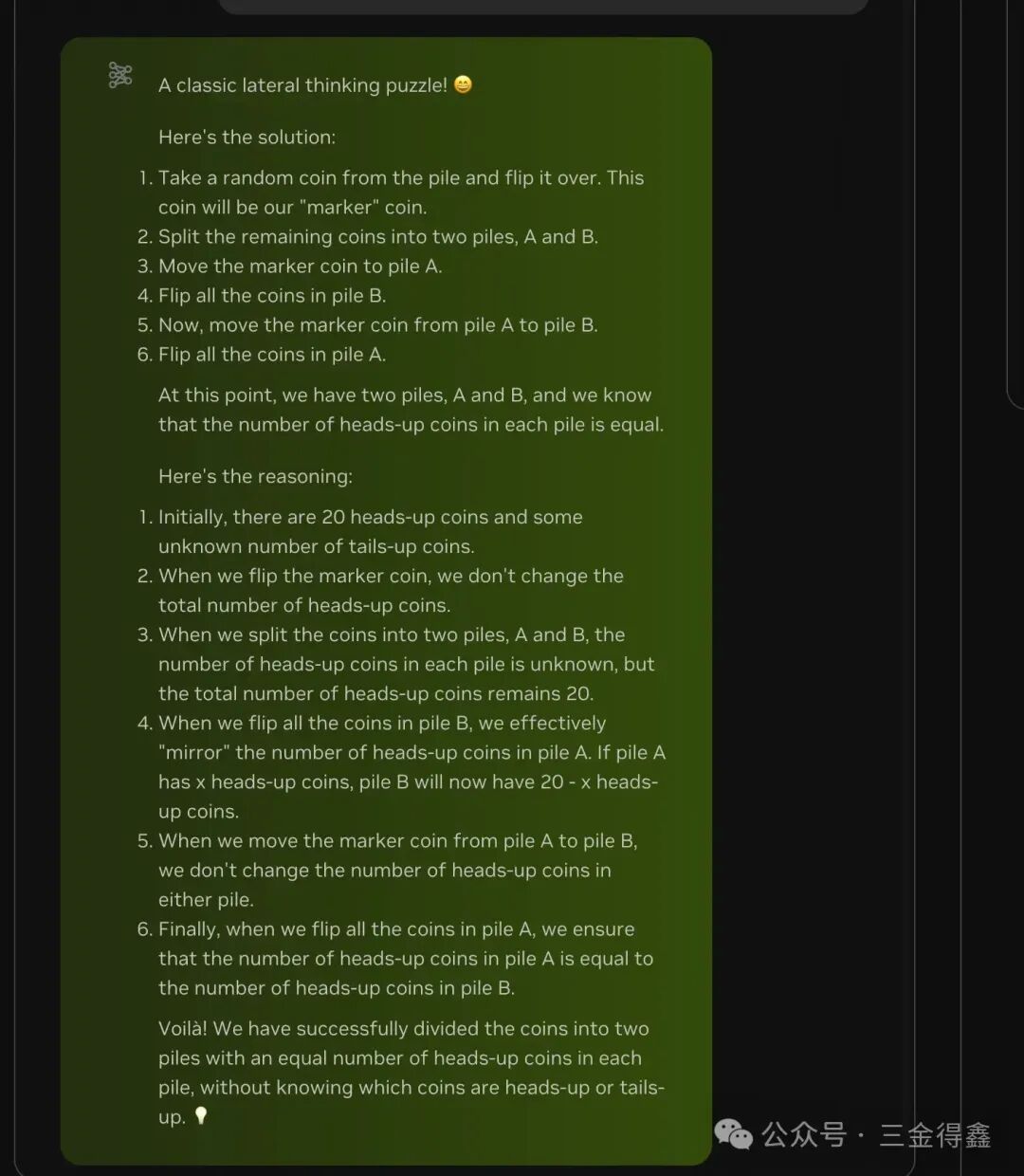 不过再绕一点的逻辑题它的回答是有问题的(原题地址:https://zhuanlan.zhihu.com/p/246173645): 你被带到一张桌子前坐了下来,桌子上有一大堆硬币。你还没来得及看清楚桌上到底有多少枚硬币,眼睛就被人蒙上了。这时,有一个声音告诉你,在桌上的硬币里,有二十枚正面朝上,其余的都是反面朝上。现在你可以随意移动桌上的硬币,也可以随意把任意数量的硬币翻面。但你无法通过手指判断某一枚是正面朝上还是反面朝上。 耳边的声音又出现了。他要求你把桌上的硬币分成两堆,在每一堆中,正面朝上的硬币数量必须相等。如果做不到的话,他就一枪打死你。请问,你该怎么做呢?
