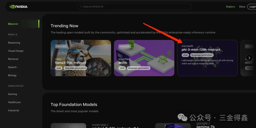大的分类上,平常能用到的就是推理(Reasoning)、视觉设计(Visual Design)和最近趋势(Trending now)。在 Gaming 里还有数字人,不过建模实属简陋,感兴趣的小伙伴可以自行探索,我们主要演示推理和视觉设计。 最近趋势(Trending now)这个里面就是最近比较火的一些模型,比如 Llama-3、Phi-3 和 Stable Diffusion 等等。以 Phi-3-mini-128k-instruct 为例: