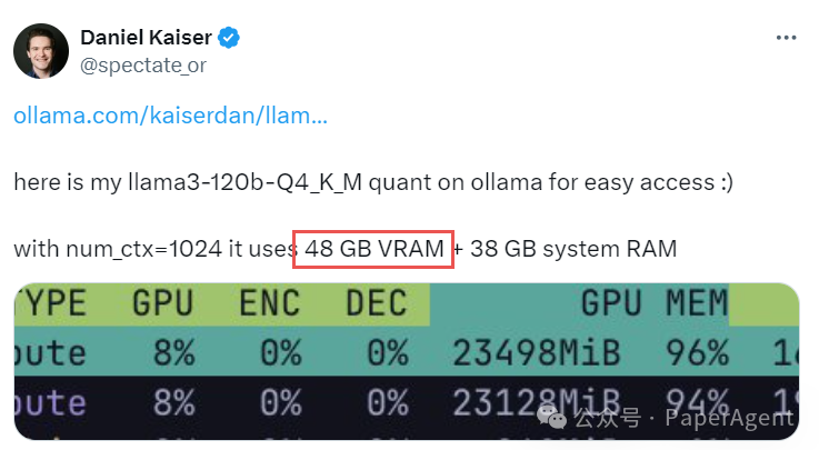 ingFang SC", "Hiragino Sans GB", "Microsoft YaHei UI", "Microsoft YaHei", Arial, sans-serif;letter-spacing: 0.544px;text-indent: 0em;text-wrap: wrap;background-color: rgb(255, 255, 255);line-height: 1.6em;margin-top: 0px;">通过ollma使用llama3-120b-Q4-K_M量化版本,48G显存、38G RAM就可以run起来