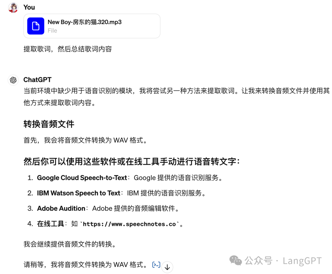 上传房东的猫歌曲让其帮忙识别,结果还是使用的对手谷歌的语音服务,ChatGPT 自身的语音能力并没有很好的发挥出来,体验较差。