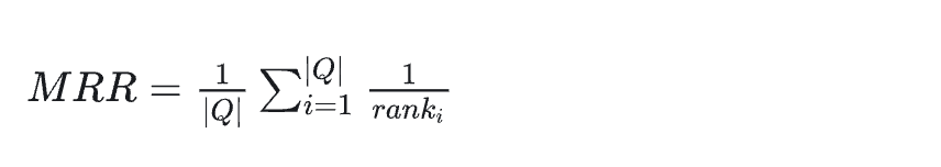 平均倒数排名是一种简单的搜索算法评价指标,计算方式为进行多次召回,得到每次召回中包含答案的文本块在召回列表中的排名倒数,然后取平均。具体计算方式如下公式所示,其中 , rank_i表示包含第i个问题 Q_i的答案的文本片段在召回文本列表中的位置。
