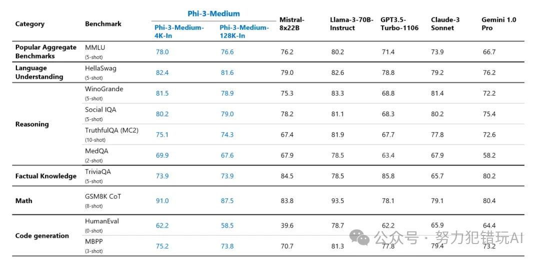 • Phi-3-medium: 一个 140 亿参数的语言模型,提供两种上下文长度(128K 和 4K)。
