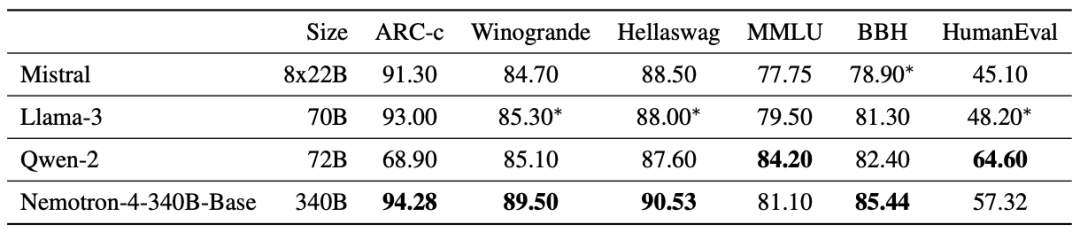 在本节中,我们展示了 Nemotron-4-340B-Base 的评估结果。我们将我们的模型与其他开源基础模型进行了比较,如 Llama-3 70B、Mistral 8x22 和 Qwen-2 72B。以下是我们评估模型的任务列表和设置: