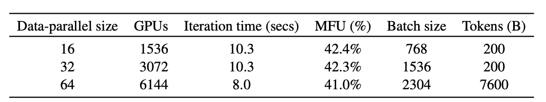 我们使用 8 路张量并行、12 路流水线并行与交错和数据并行的组合来训练模型;我们还使用分布式优化器在数据并行副本上分片优化器状态,减少训练的内存占用。随着批量大小的增加,数据并行度从 16 扩展到 64。表2 总结了批量大小增加的3个阶段,并包括每次迭代的时间和模型 FLOP/s 利用率(MFU)。MFU 量化了 GPU 在模型训练中的利用效率,100% 是理论峰值。