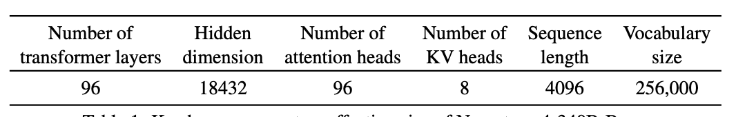 Nemotron-4-340B-Base 的架构与 Nemotron-4-15B-Base相似。它是一个标准的解码器 Transformer 架构,具有因果注意力掩码,使用旋转位置嵌入(RoPE),SentencePiece 分词器,以及在 MLP 层中使用平方 ReLU 激活。没有使用 bias,dropout 为零,并且输入输出嵌入是未绑定的。我们也使用了分组查询注意力(GQA)。Nemotron-4-340B-Base 的超参数如表1所示,有 94 亿嵌入参数和 3316 亿非嵌入参数。