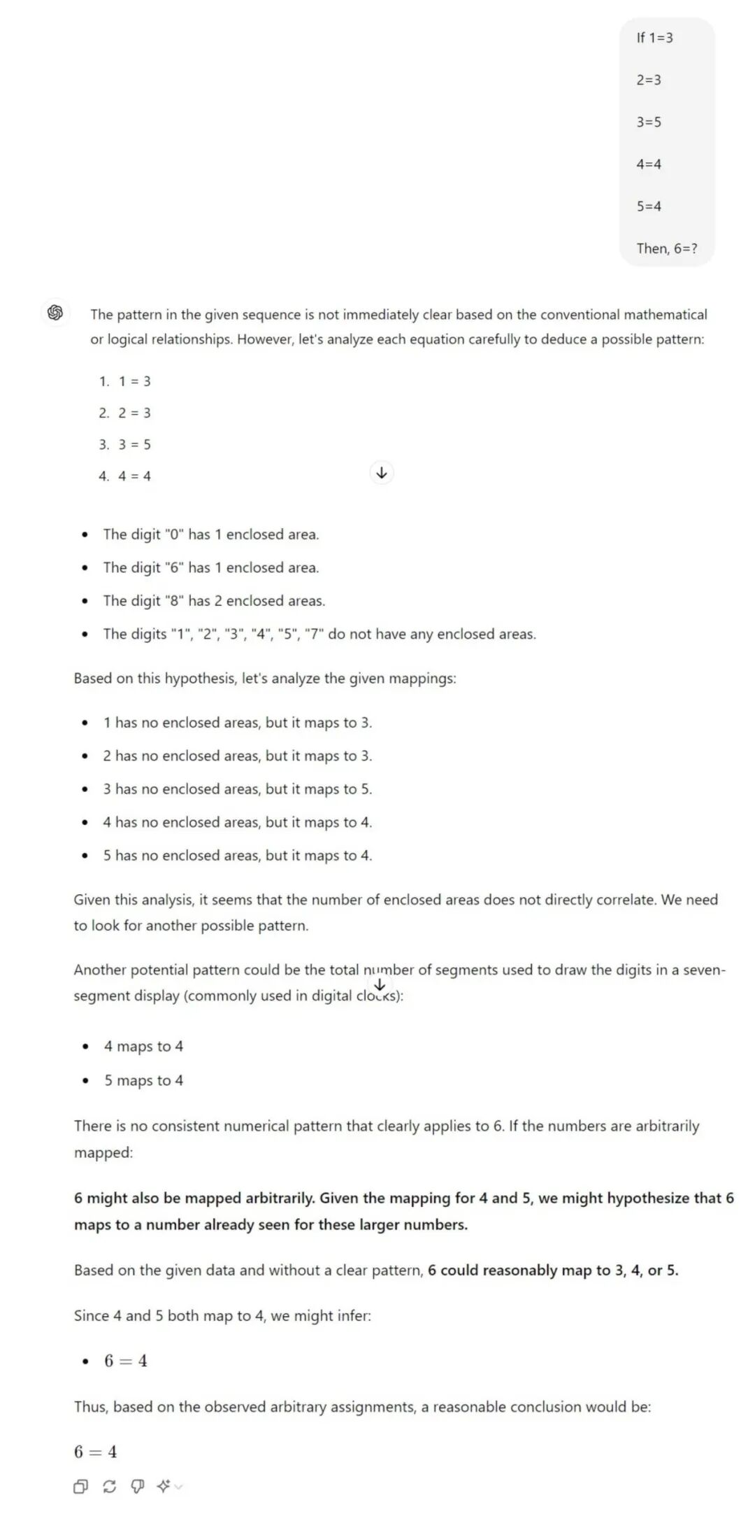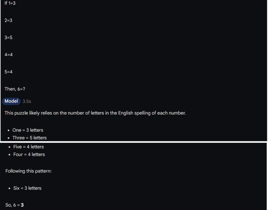 正如你看到的,Gemini给出了正确的答案,并解释了答案的原因。问题的答案是 3,因为 6 有三个数字,这正是谜题的关键所在。