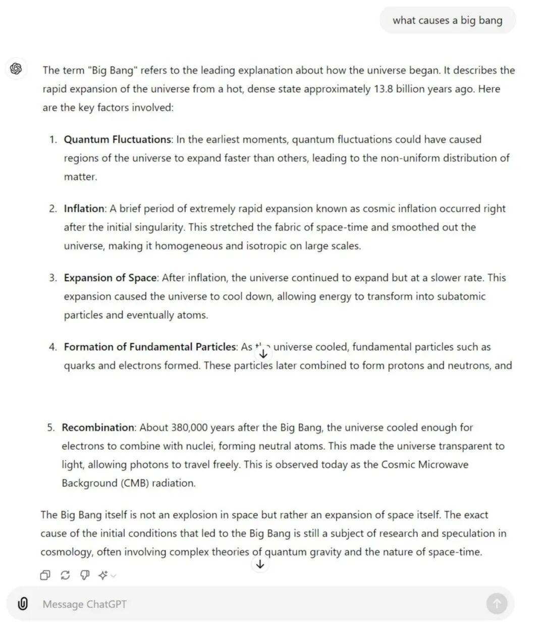 我们想要看看OpenAI和谷歌等强大的人工智能模型是否具备有关宇宙的基本常识,所以我们提出了一个关于宇宙大爆炸的问题。