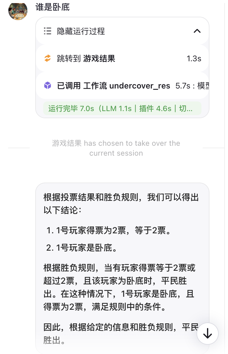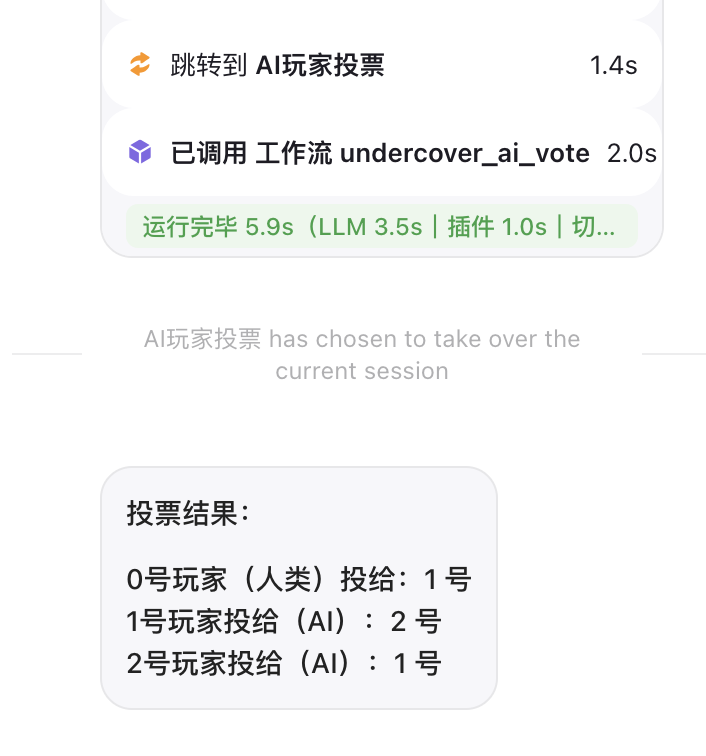 这个完成后,我们就很容易扩展出多名玩家。若第一轮投票,卧底未出局,则踢出被投的玩家,然后跳转到前面的 Agent 继续游戏。