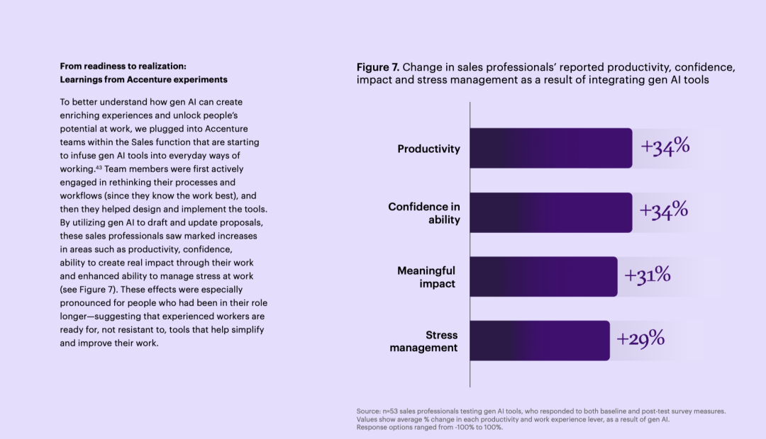 生成式AI对工作体验和效率的提升为了探索生成式AI如何在商业环境中提升员工的工作体验和效率,埃森哲研究人员在销售职能部门中进行了一项实验。  实验背景与目的:研究团队将生成式AI工具融入日常工作流程,以丰富员工体验并激发其潜力。首先,团队成员积极参与重新思考并设计其工作流程,然后帮助开发和实施这些工具。通过这种方式,他们不仅提高了工作效率,还增强了对自己能力的信心。 AI工具的具体应用:销售人员利用生成式AI起草和更新提案,这一过程显著提高了他们的生产力和工作质量。更重要的是,这使他们能够更有效地管理工作压力,并感受到他们的工作能够带来实际影响。