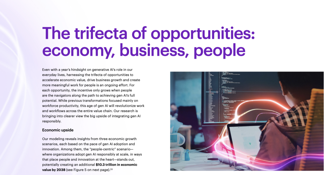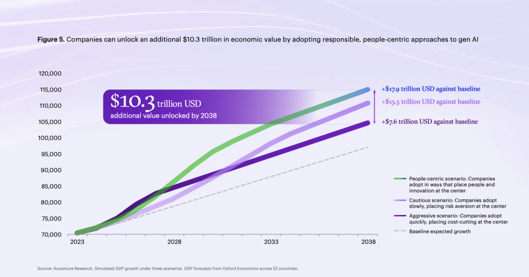 以上这些数据反映了企业在实施AI策略时面临的内部信任挑战。高层领导通常低估了员工对AI技术带来的潜在威胁和挑战的关注程度。为了更有效地整合并利用AI技术,企业需要加强内部沟通,确保员工的技术理解和技能培训跟上步伐,同时认真对待员工的担忧和反馈,建立一个基于信任和透明度的工作环境。这不仅有助于技术的有效应用,也是维护团队凝聚力和提高员工满意度的关键。  Gen AI的三重机遇:经济、商业和个人生成式人工智能(Gen AI)所提供的“机遇三重奏”是指它在推动经济增长、促进商业发展以及创造更有意义的工作机会方面的综合潜力。这种描述突出了生成式AI如何跨越多个领域带来正面影响,不仅能够加速经济价值的实现,还能促使企业增长,并为个人工作提供更丰富、更深入的价值。通过这样的三重效应,生成式AI被视为一个全方位的增长动力。  经济根据不同的生成式人工智能策略,到2038年可能实现的全球经济增长情况分析如下图。  以人为本(People-centric):公司将创新和人才放在核心位置来采用AI。在这种模式下,预计到2038年可以额外解锁10.3万亿美元的经济价值,是三种情景中增长最多的。 谨慎(Cautious):公司较为缓慢地采用AI,将风险规避作为核心。这种情景下的经济增长额外提高7.6万亿美元。 激进(Aggressive):公司迅速采用AI,以降低成本为中心。在这种策略下,预计经济增长将额外提高13.5万亿美元。