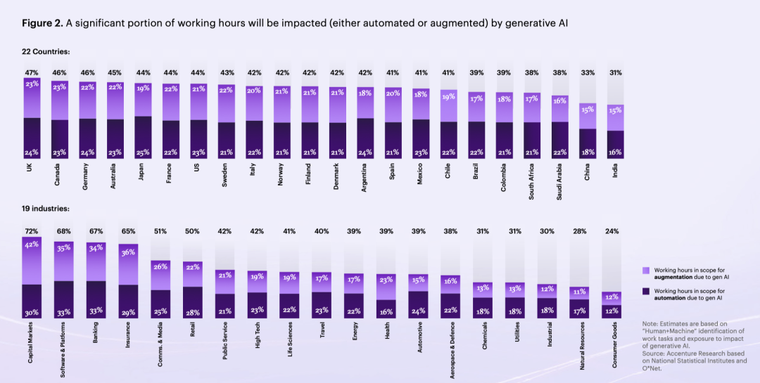 生成式AI对工作时间的影响埃森哲分析了生成式AI对工作时间的潜在影响,涵盖了22个国家和19个行业。  国家层面:- 图表上半部分显示的是各个国家中受AI影响的工作小时数的比例。例如,中国的数据显示,总共有33%的工作小时可能受到人工智能的影响,其中18%的工作小时可能会被自动化,另外15%可能会通过AI得到增强。这一比例低于其他一些发达国家如英国(47%)、加拿大(46%)和德国(46%)。