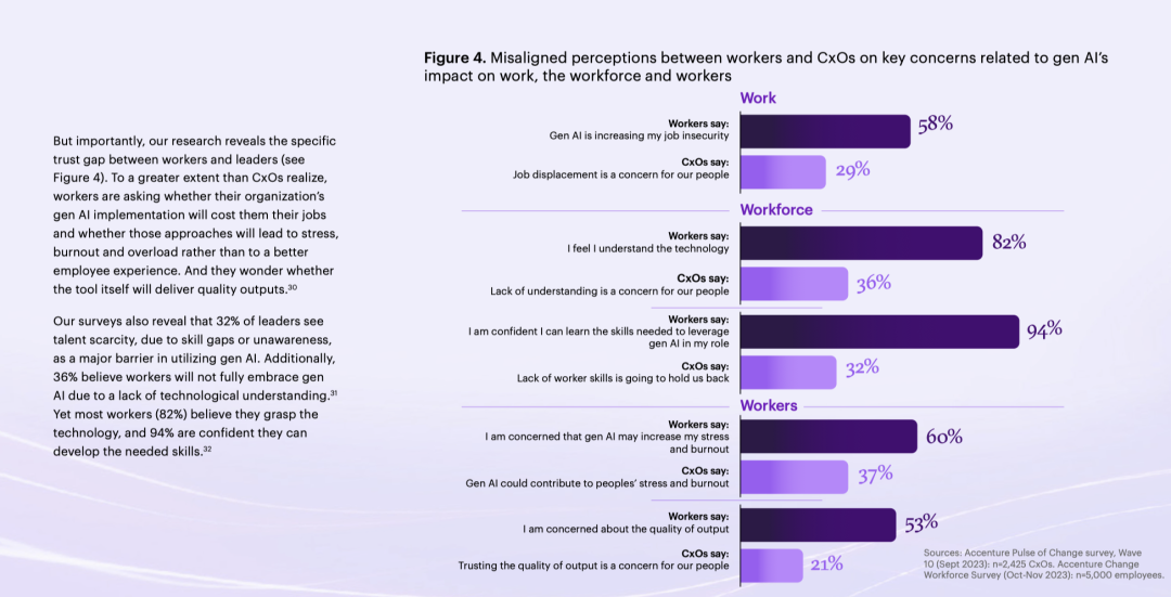 企业管理层与员工对Gen AI的理解企业管理层(CxOs)与员工在对生成式人工智能(gen AI)影响的关键问题上存在显著的认知差异,这种差异可能会侵蚀内部的信任感并影响技术的成功应用。  工作安全感- 员工观点:超过半数(58%)的员工认为生成式AI让他们感受到工作安全性的威胁。