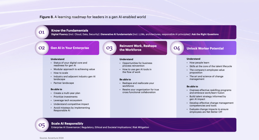 实验意义:实验结果表明,即使是在职位上有较长经验的员工,也表现出对简化和改进工作流程工具的接受和积极响应。这说明经验丰富的工作者不仅准备好使用这些工具,而且能从中受益,这对公司的AI策略是一个积极的信号。 企业如何应用生成式AI埃森哲的报告为企业管理者在生成式AI方向提供了一个详尽的学习路线图,旨在帮助他们有效利用AI技术,以优化企业运营和员工潜力。  了解基础知识:领导者需要掌握数字技术的基本知识,包括云计算、数据管理和安全性等,以及生成式AI的基础,如大型语言模型(LLMs)、架构和负责任的AI原则。此外,还需学会提出正确的问题,以深入理解AI技术如何服务于业务。 在企业中应用Gen AI:领导者需了解企业的数字化现状和对AI的准备情况。制定多年计划,优先考虑投资,利用技术生态系统,并通过实施负责任的AI避免误操作,以实现AI的价值最大化。 重新定义工作,重塑劳动力:利用AI技术重塑业务流程,确保AI工具能在工作流中得到有效应用。此步骤包括重新配置和调配劳动力资源,以及改造组织结构,实现真正的跨功能协作。 释放员工潜力:理解员工学习方式和职业生命周期中的核心技能,构建与AI影响相适应的人才战略。管理层应推行有效的再培训项目,并融合工作与学习,同时发展有效的变革管理能力和工具,确保员工在变革中受益。 负责任地扩展AI应用:在企业层面上,领导者需要关注AI的治理、法规遵循以及伦理和社会影响,确保风险得到妥善管理。这一步骤对于实现可持续和负责任的AI应用至关重要。
