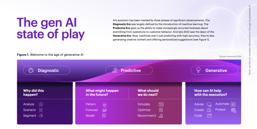 人工智能发展的三个主要阶段人工智能的发展可以划分为三个重要阶段:诊断(Diagnostic)、预测(Predictive)和生成(Generative)。  诊断时代:在这一阶段,AI的主要功能是解析和诊断问题,它通过机器学习技术帮助我们理解“为什么会发生这种情况?”。此时,AI主要应用于数据分析、场景模拟和市场细分等方面。比如在医疗领域,AI通过分析病历和检测结果,帮助医生诊断疾病,识别疾病的潜在风险因素。 预测时代:随着技术的进步,AI开始能够对未来进行更加精准的预测,涵盖从企业运营到消费者行为等多个领域。这一阶段的核心在于回答“将来会发生什么?”问题,主要通过模式识别、趋势预测和建模来实现。比如电商平台利用AI技术预测消费者的购买行为。通过分析用户的浏览和购买历史,AI可以预测哪些商品在未来会受到欢迎,并帮助商家优化库存和营销策略。 生成时代:从2022年起,AI进入了生成时代。在这个阶段,AI不仅能预测未来,还能创造解决方案和内容。它开始在我们决策的过程中发挥更大的作用,提供“接下来我们应该做什么?”的建议,并在实施过程中提供辅助,如模拟、优化和提供执行策略。此外,AI还能够参与创意内容的生成、编程和自动化保护工作。其实在这个阶段的AI是我们感受最为深刻的,因为类似ChatGPT这样的AI工具,拉近了我们和AI的距离。