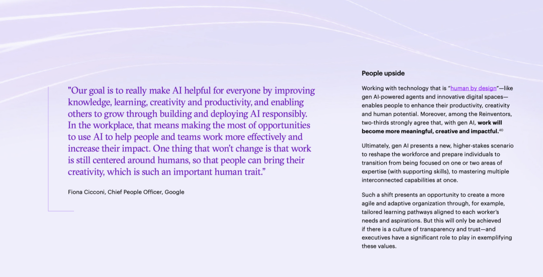 个人在当前的AI技术进步背景下,谷歌首席人力资源官Fiona Cicconi深入探讨了人工智能(AI)在提升工作效率及创新方面的潜力。  AI的核心目标:Cicconi表示,谷歌致力于使AI惠及每个人,通过提升知识、学习、创造力和生产力,促进个体的成长和发展。在工作场所,AI的部署目的在于最大化利用潜在机会,提高团队的工作效率和影响力。 以人为本的AI设计:她提到,通过采用“以人为本”的AI设计,如AI Agent和创新的AI工具,能够增强员工的生产力和创新能力。这将使工作变得更具意义、创造性和影响力。 Work will become more meaningful, creative and impactful.