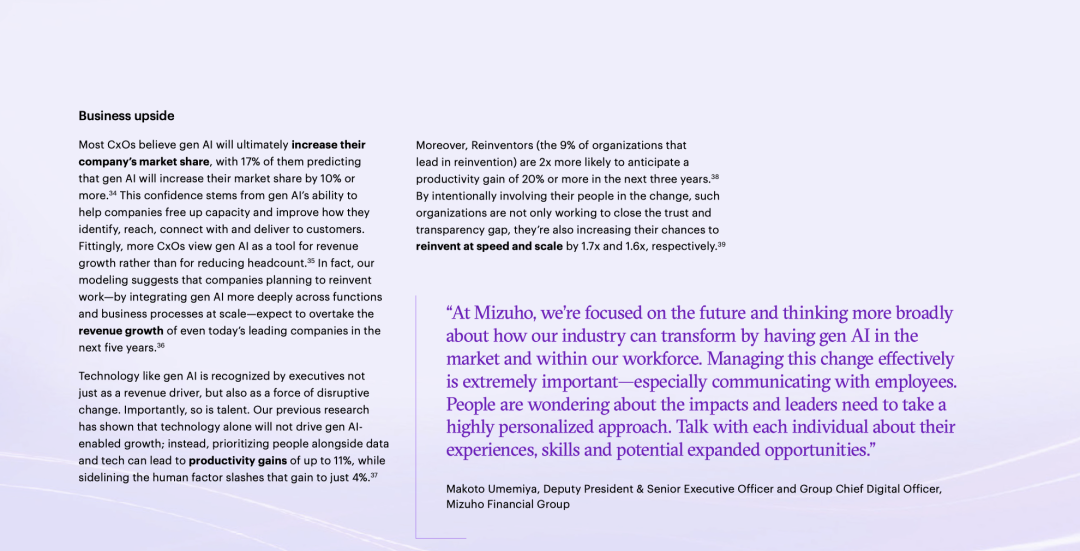 通过埃森哲的这些数据,可以看出,采用以人为本的策略不仅能推动经济增长,而且潜在增长幅度最大,显示了将人才和创新放在企业战略核心位置时的长远利益。 商业埃森哲探讨了生成式人工智能在商业层面带来的潜在好处,并强调了人才和技术并重的重要性。  市场份额增长:多数企业高层(CxOs)认为,利用生成式AI将最终增加公司的市场份额。有17%的高层预测,通过AI的帮助,他们的公司在未来三年内市场份额至少增长10%。这种信心源于AI能够帮助企业提高效率,更好地识别、接触、连接和服务于客户。 收入增长:更多的高层看待AI作为增长收入的工具,而不仅仅是减少员工数目。模型预测显示,那些计划通过在各职能部门和业务流程中更深入地整合AI的公司,预计在未来五年将超越当今领先公司的收入增长。 生产力提升:重视人才的公司在使用AI时能够实现最高达11%的生产力提升,而如果忽视人的因素,这一增益可能下降至仅4%。这表明,在AI实施过程中,技术与人才并重是至关重要的。 重新发明与规模化:文中提到,“重新发明者”(那些在重新发明方面领先的组织)更有可能预计到产品力提升超过20%。这些组织通过积极让员工参与变革,不仅努力缩小信任和透明度差距,而且通过以1.7倍和1.6倍的速度进行规模化创新,增加了他们的再发明能力。