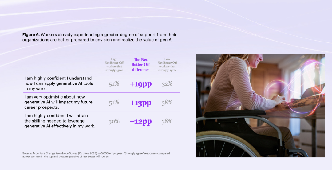 - 有51%的受较高支持的员工对生成式AI将如何影响他们未来的职业前景持乐观态度。