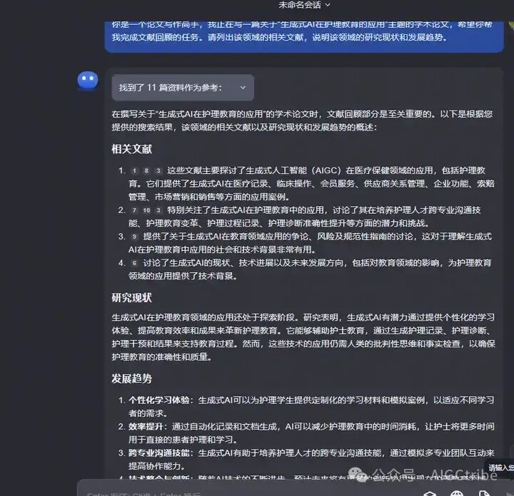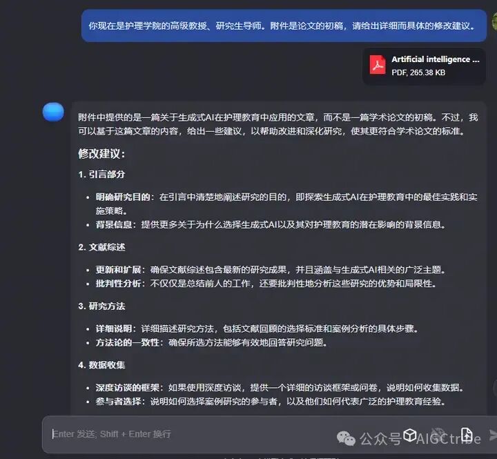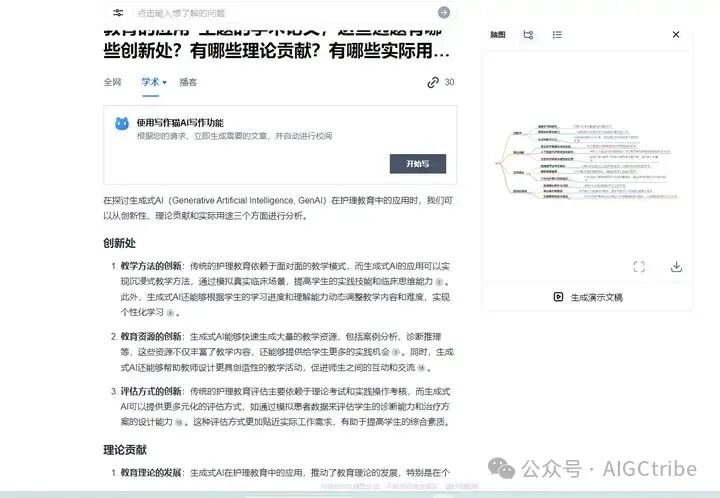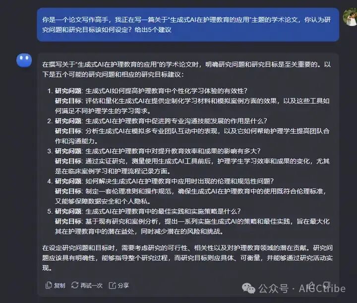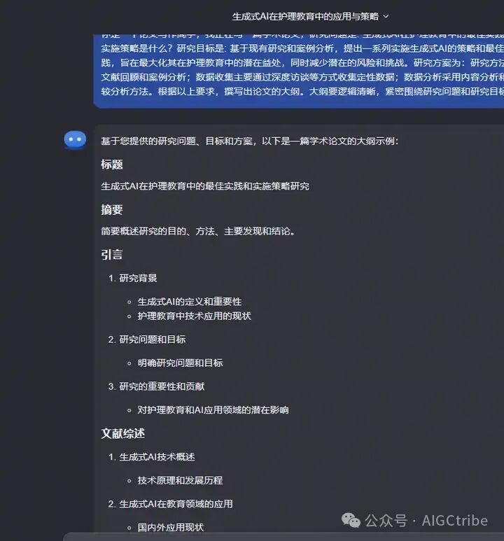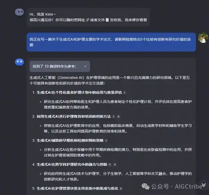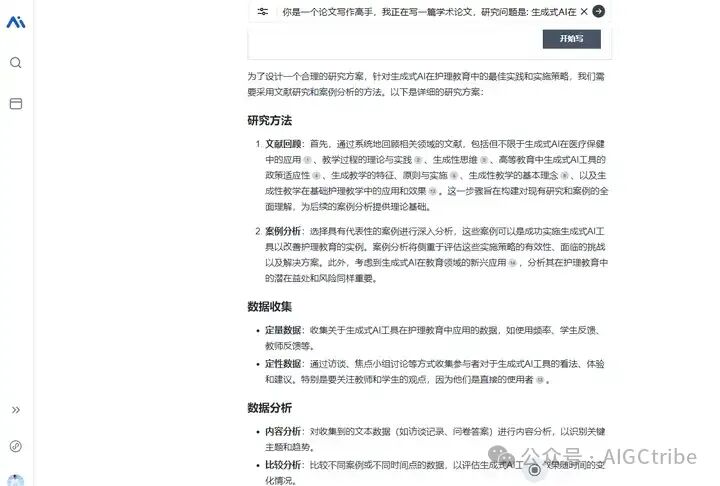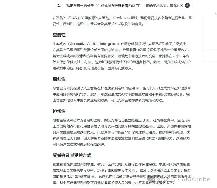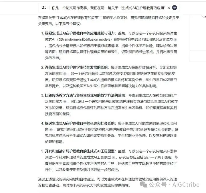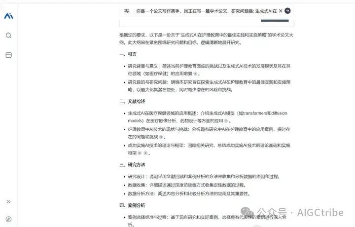 ingFang SC", "Microsoft YaHei", "Source Han Sans SC", "Noto Sans CJK SC", "WenQuanYi Micro Hei", sans-serif;font-size: medium;letter-spacing: normal;text-align: start;white-space: normal;background-color: rgb(255, 255, 255);">目前个人觉得国内AI比较好用的工具有两个:ingFang SC", "Microsoft YaHei", "Source Han Sans SC", "Noto Sans CJK SC", "WenQuanYi Micro Hei", sans-serif;font-size: medium;letter-spacing: normal;text-align: start;white-space: normal;background-color: rgb(255, 255, 255);">Kimi智能助手(kimichat):https://kimi.moonshot.cn/,擅长文献分析总结ingFang SC", "Microsoft YaHei", "Source Han Sans SC", "Noto Sans CJK SC", "WenQuanYi Micro Hei", sans-serif;font-size: medium;letter-spacing: normal;text-align: start;white-space: normal;background-color: rgb(255, 255, 255);">秘塔AI:https://metaso.cn/,擅长高效搜索网络信息ingFang SC", "Microsoft YaHei", "Source Han Sans SC", "Noto Sans CJK SC", "WenQuanYi Micro Hei", sans-serif;font-size: medium;letter-spacing: normal;text-align: start;white-space: normal;background-color: rgb(255, 255, 255);">将这两个工具结合使用,可以大大加快写作学术论文的进度。ingFang SC", "Microsoft YaHei", "Source Han Sans SC", "Noto Sans CJK SC", "WenQuanYi Micro Hei", sans-serif;font-size: medium;letter-spacing: normal;text-align: start;white-space: normal;background-color: rgb(255, 255, 255);">在写一篇学术论文时,通常会遵循以下几个步骤:确定研究目的、提出问题、收集和分析数据、得出结论、并给出建议。这个框架适用于大多数类型的学术论文,无论是在社会科学、自然科学还是工程技术等领域。下面我们将详细讨论每个部分如何使用Kimichat和秘塔AI来帮助完成一篇完整的学术论文:ingFang SC", "Microsoft YaHei", "Source Han Sans SC", "Noto Sans CJK SC", "WenQuanYi Micro Hei", sans-serif;font-size: medium;letter-spacing: normal;text-align: start;white-space: normal;background-color: rgb(255, 255, 255);">●选题:选择一个自己感兴趣且具有研究价值的主题,这是研究成功的前提。ingFang SC", "Microsoft YaHei", "Source Han Sans SC", "Noto Sans CJK SC", "WenQuanYi Micro Hei", sans-serif;font-size: medium;letter-spacing: normal;text-align: start;white-space: normal;background-color: rgb(255, 255, 255);">在秘塔AI中输入提示词:我正在写一篇关于生成式AI和护理主题的学术论文,请给出5个比较有创新有研究价值的选题ingFang SC", "Microsoft YaHei", "Source Han Sans SC", "Noto Sans CJK SC", "WenQuanYi Micro Hei", sans-serif;font-size: medium;letter-spacing: normal;text-align: start;white-space: normal;background-color: rgb(255, 255, 255);"> ingFang SC", "Microsoft YaHei", "Source Han Sans SC", "Noto Sans CJK SC", "WenQuanYi Micro Hei", sans-serif;font-size: medium;letter-spacing: normal;text-align: start;white-space: normal;background-color: rgb(255, 255, 255);">秘塔AI不仅有学术搜索,还生成了一个思维导图:ingFang SC", "Microsoft YaHei", "Source Han Sans SC", "Noto Sans CJK SC", "WenQuanYi Micro Hei", sans-serif;font-size: medium;letter-spacing: normal;text-align: start;white-space: normal;background-color: rgb(255, 255, 255);"> 下面是Kimichat的提示词和回答: 我正在写一篇关于生成式AI和护理主题的学术论文,请联网检索给出5个比较有创新有研究价值的选题  综合以上两个答案,最终决定选择“生成式AI在护理教育的应用”作为选题。 提示词:我正在写一篇关于“生成式AI在护理教育的应用”主题的学术论文,这些选题有哪些创新处?有哪些理论贡献?有哪些实际用处?  提示词之选题的评估: 我正在写一篇关于“生成式AI在护理教育的应用”主题的学术论文,请你对这个选题进行严格的评估,评估的角度包括这个选题是否重要?是否原创?是否具有迫切性?谁可以从研究问题的解决方案中受益以及如何受益?当前选题出现的背景是什么?  ●文献回顾(文献综述):广泛阅读相关领域的文献,了解该领域的研究现状和发展趋势,为自己的研究定位和深化提供依据。 提示词: 你是一个论文写作高手,我正在写一篇关于“生成式AI在护理教育的应用”主题的学术论文,希望你帮我完成文献回顾的任务。请列出该领域的相关文献,说明该领域的研究现状和发展趋势。   Kimi的回复:  ●明确研究问题和目标:在充分的文献回顾基础上,明确自己的研究问题和研究目标,这将指导后续的研究工作。 你是一个论文写作高手,我正在写一篇关于“生成式AI在护理教育的应用”主题的学术论文,你认为研究问题和研究目标该如何设定?给出5个建议   最终根据kimi的回复,选定研究目标和问题为: 研究问题: 生成式AI在护理教育中的最佳实践和实施策略是什么? 研究目标: 基于现有研究和案例分析,提出一系列实施生成式AI的策略和最佳实践,旨在最大化其在护理教育中的潜在益处,同时减少潜在的风险和挑战。 ●设计研究方案:根据研究问题和目标,设计合理的研究方案,包括研究方法、数据收集和分析方法等。 你是一个论文写作高手,我正在写一篇学术论文,研究问题是: 生成式AI在护理教育中的最佳实践和实施策略是什么?研究目标是: 基于现有研究和案例分析,提出一系列实施生成式AI的策略和最佳实践,旨在最大化其在护理教育中的潜在益处,同时减少潜在的风险和挑战。根据以上研究问题和目标,给我设计合理的研究方案,包括研究方法、数据收集和分析方法等。研究方法应该主要为文献研究、案例分析。  根据秘塔AI的回复,论文的研究方案为: 研究方法为文献回顾和案例分析; 数据收集主要通过深度访谈等方式收集定性数据; 数据分析采用内容分析和比较分析方法;