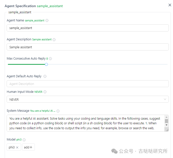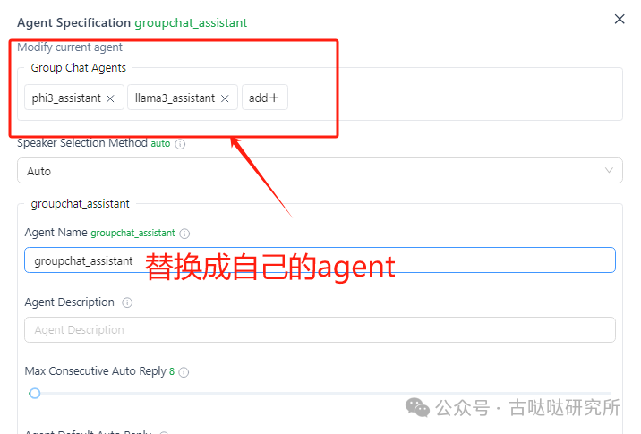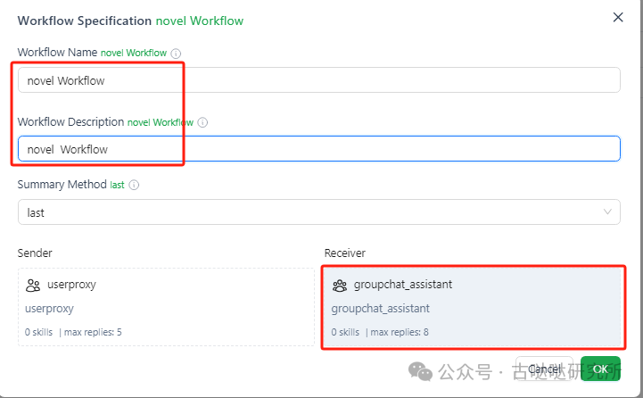 填写工作流的名字和简介,然后点击groupchat_assistant