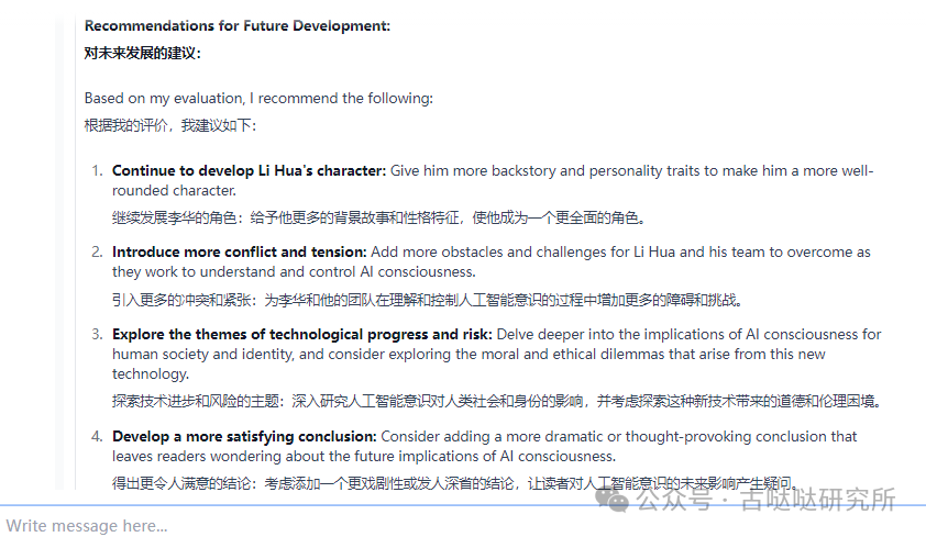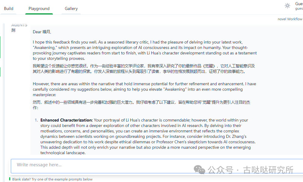 这里使用的两个原生大模型没有经过中文微调,所以一直在飙英文,偶尔夹杂几句中文。 到这里,我们没有写一行代码就实现了两个大模型的互相对话,共同完成工作流的任务。 只做简单演示之用,此外还可以通过添加python代码插件增强工作流处理复杂任务的能力。具体细节可以参考项目文档。
