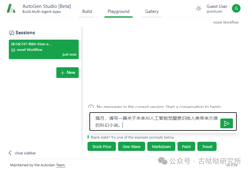 然后保存工作流返回 去到palygound页面,创建新会话来执行工作流