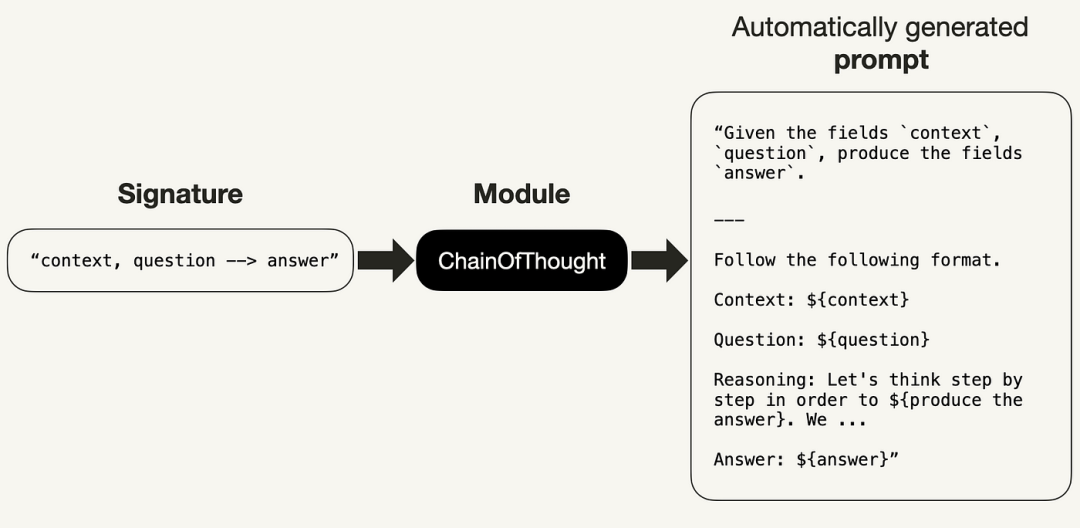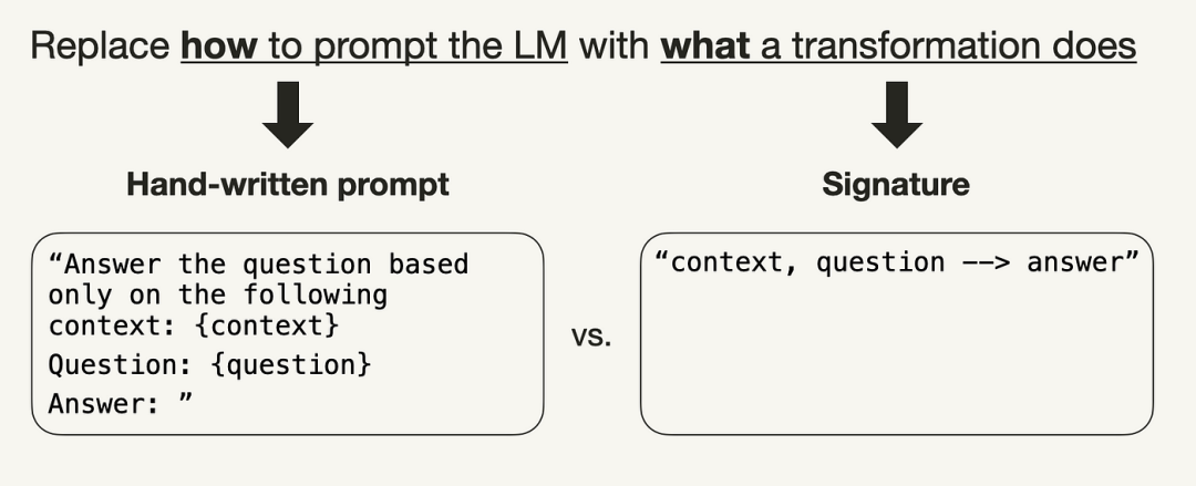 • 签名(Signature)是对 DSPy 模块的输入/输出行为的声明式规范。签名使得只需要告诉语言模型它需要做什么,而不是描述语言模型如何去做。引入签名是避免直接手写Prompt,而是通过框架自动优化生成高质量Prompt。这样有助于编写模块化且干净的代码,其中对于LM 调用可以被优化成高质量的Prompt(或自动微调)。