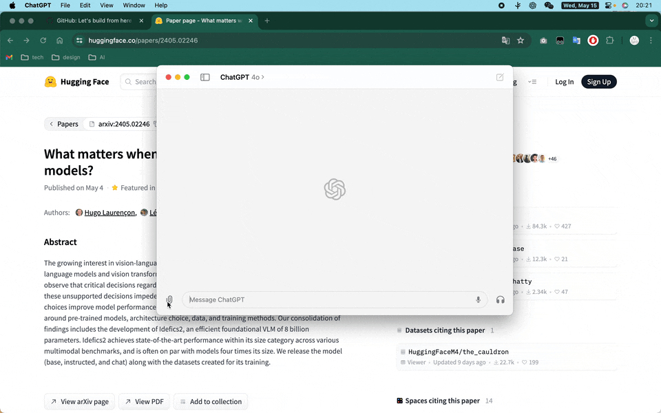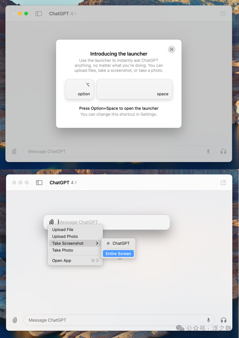 上传功能和网页版没有太大区别,除了文件上传(Upload File)还多了照片(Upload Photo)、截图(Take Screenshot)和拍照(Take Photo)上传。而截图上传算是一个比较好用的功能,可以截取正在运行的应用界面(如浏览器、桌面、预览文件等)直接发送给 ChatGPT。
