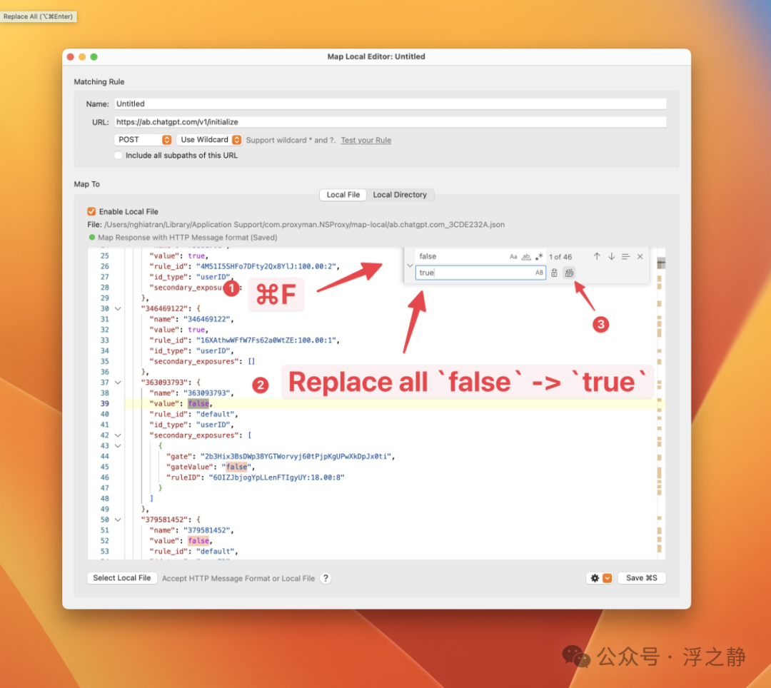 6. 此时你会看到许多请求:按 ⌘F 打开筛选器 → 输入 init → 右键点击请求 → 工具(Tools) → 选择 Map Local