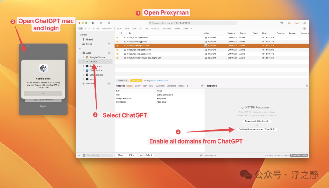 4. 点击 “Enable all domains from ChatGPT”。(如果这是你第一次使用 Proxyman 应用,它会提示你在 Mac 上安装并信任证书。因为证书是在你的 Mac 上生成的,所以是安全的。你可以在钥匙串中或通过证书菜单 -> 重置来删除它)