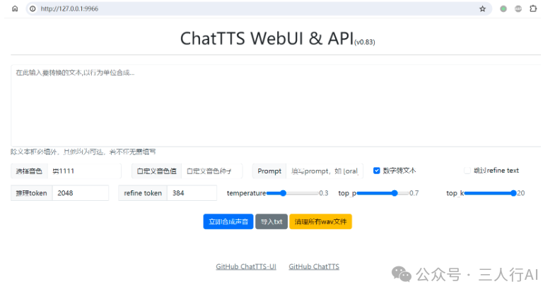 2.创建空目录/data/chattts执行命令cd /data/chattts && git clonehttps://github.com/jianchang512/chatTTS-ui .3.创建虚拟环境python3 -m venv venv4.激活虚拟环境source ./venv/bin/activate5.安装依赖pip3 install -r requirements.txt6.安装torchpip3 install torch torchaudio7.执行python3 app.py启动,将自动打开浏览器窗口,默认地址http://127.0.0.1:9966(注意:默认从 modelscope 魔塔下载模型,不可使用代理下载,请关闭代理)
